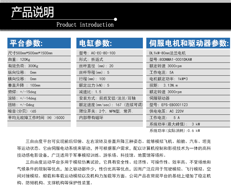 三自由度平臺(tái)可實(shí)現(xiàn)前后仰俯、左右滾轉(zhuǎn)及垂直升降三種姿態(tài)。能夠模擬飛機(jī)、船舶、汽車、坦克等運(yùn)動(dòng)狀態(tài)。它由伺服電動(dòng)系統(tǒng)來驅(qū)動(dòng),并可根據(jù)客戶需求,配以計(jì)算機(jī)控制和影視技術(shù)為一體的高科技動(dòng)感電影設(shè)備,廣泛適用于軍事模擬訓(xùn)練、游樂場、科技館、地震館等場所。